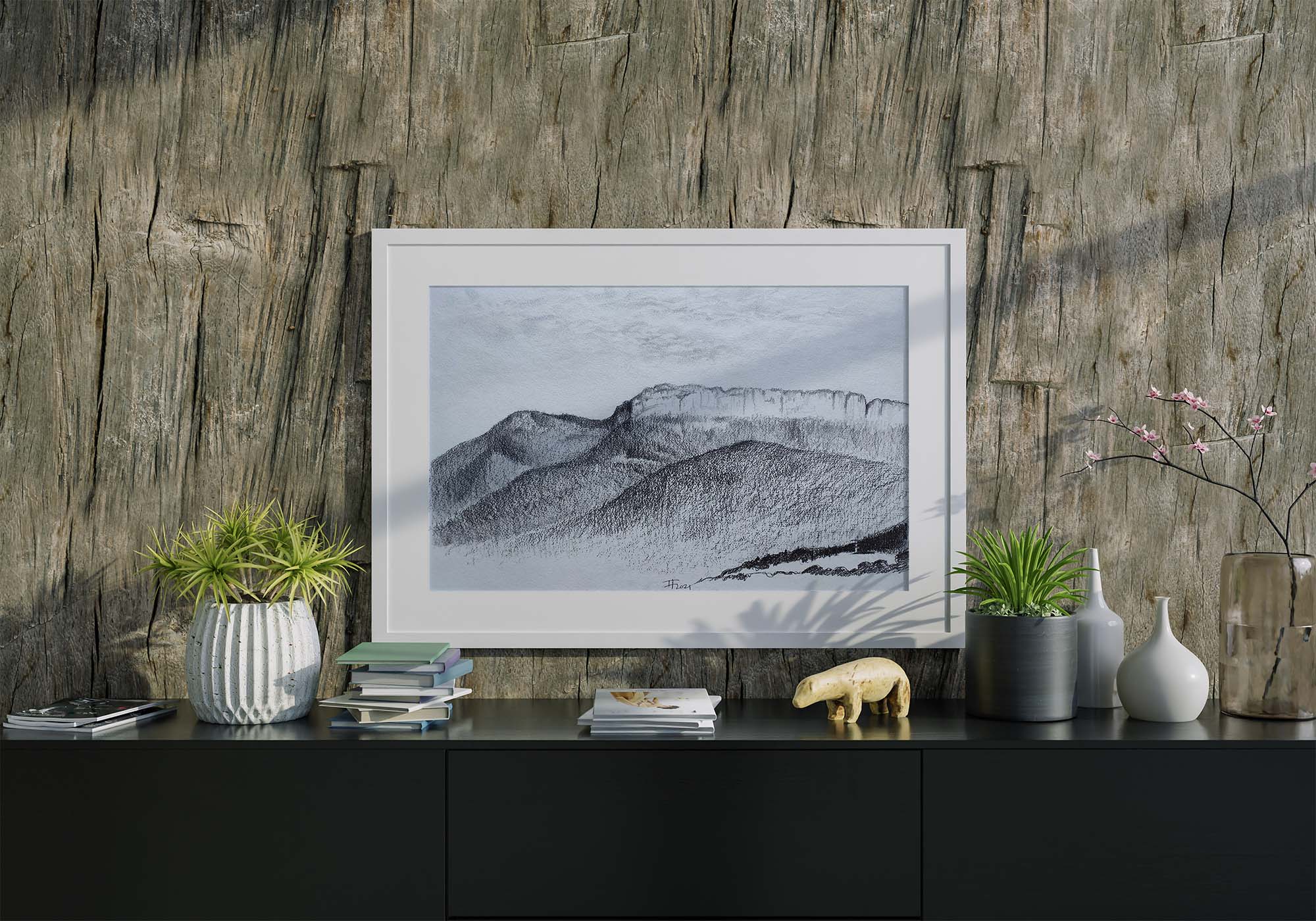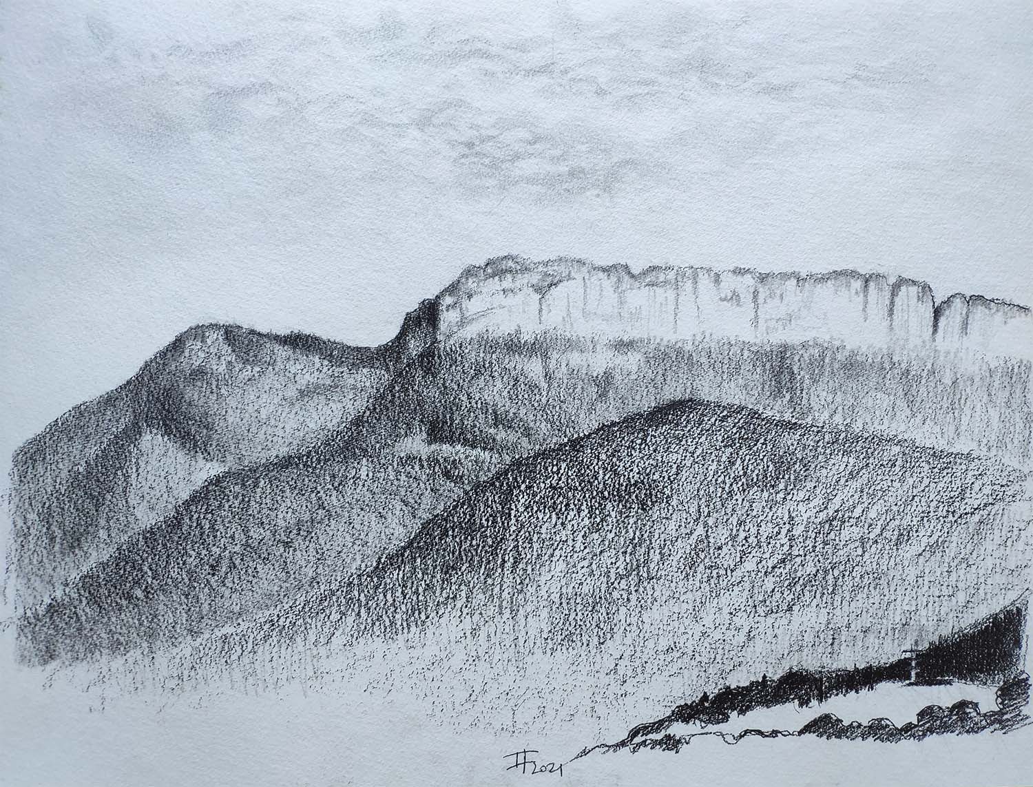 Lever de soleil sur le Parmelan à Annecy en noir et blanc. Le dessin à la mine grasse permet de nuancer les gris. C’est un jeu entre la pression du crayon et la superposition des couches.
